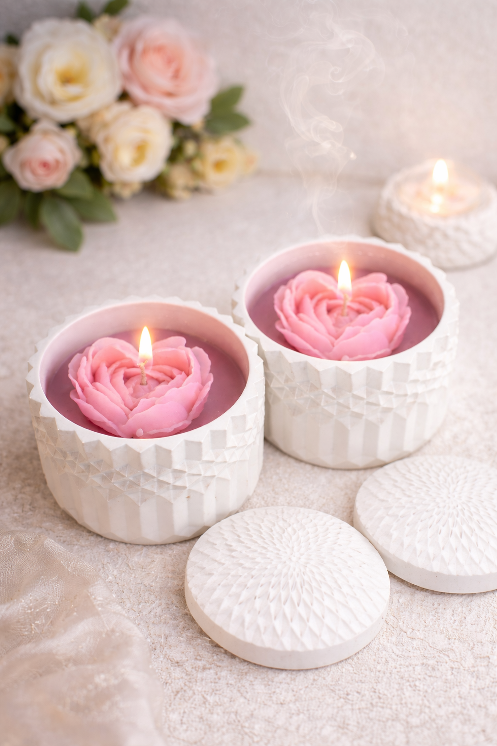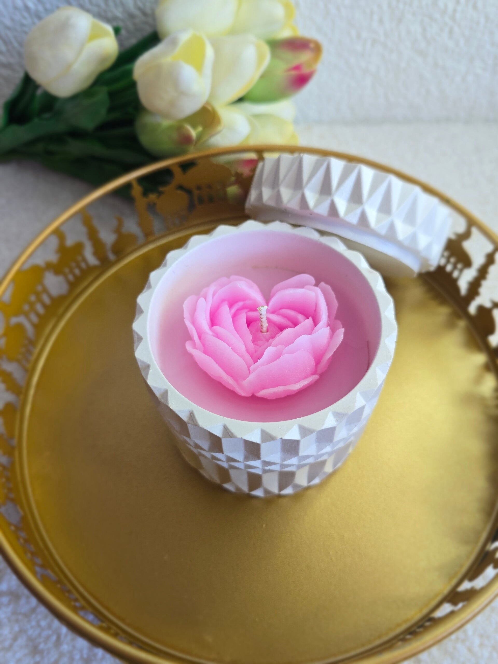 Deze handgemaakte kaars combineert een strakke witte houder met een delicate roze roos. De luxe geur van champagne, druif en roos vult je ruimte met verfijnde sfeer, perfect om jezelf te verwennen of als cadeau te geven